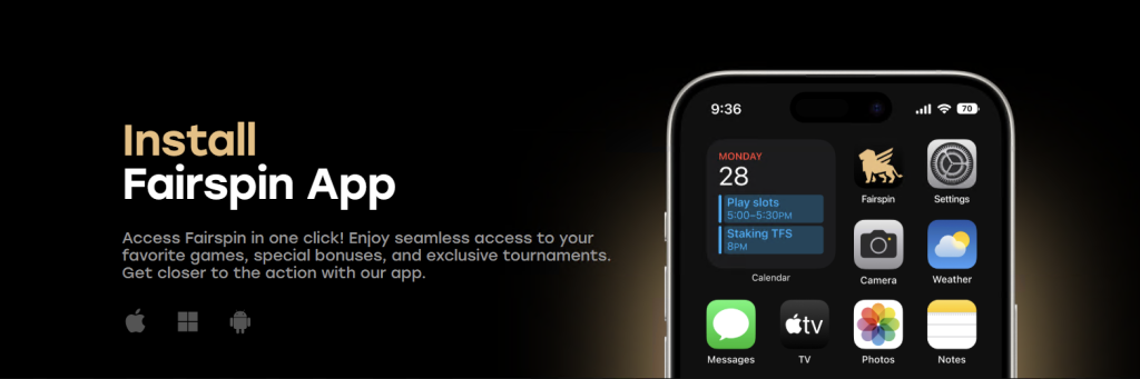 Jucătorul modern nu mai este legat de un computer desktop. Astăzi, peste 70% din jocuri au loc prin intermediul dispozitivelor inteligente, iar Fairspin s-a pregătit ideal pentru acest lucru. În loc să povârnim jucătorii cu aplicații lente din magazinele de aplicații, care au adesea restricții, am dezvoltat o soluție de top Fairspin app care utilizează tehnologia PWA (Progressive Web App).