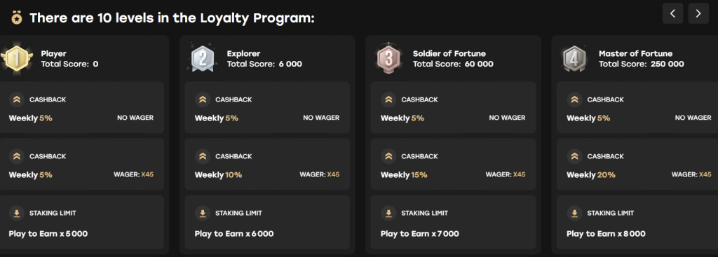 - Level 1 (Player): Acesta este punctul tău de plecare. Deja de aici beneficiezi de un sistem de cashback săptămânal de 5%, care nu are nicio cerință de rulaj. Aceasta înseamnă că primești o parte din pierderi înapoi sub formă de bani reali.